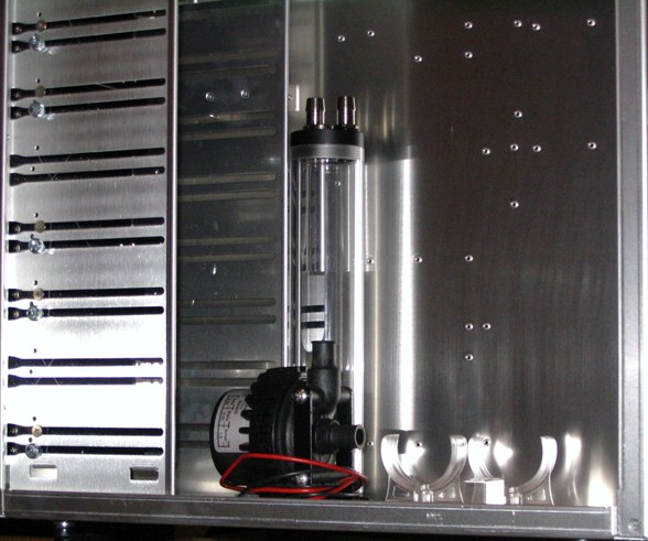 Power supply side. A 3x120mm radiator will be installed in drive bay. Here's the water pump and reservoir for this project.